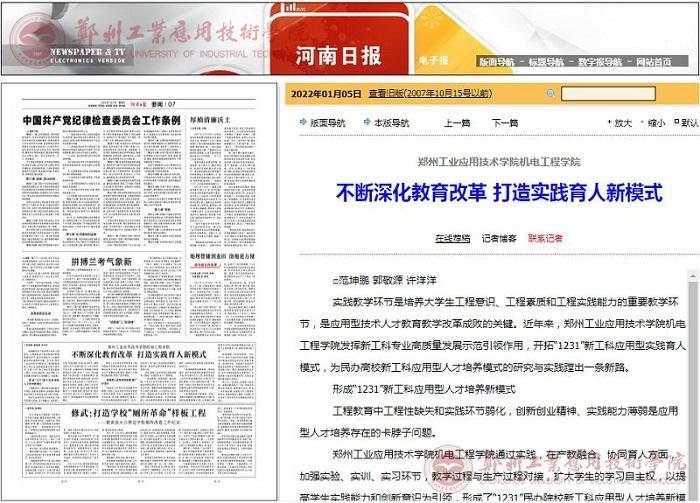 (文/郭敬源)雪落寒九天,瑞雪兆丰年。2022年的第一场雪,令人格外亲切,也分外特别。1月5日,版权所有:中国·太阳集团城(古天乐)股份有限公司|官方网站机电工程学院《不断深化教育改革 创新实践育人新模式》在《河南日报》07版刊登,顿时引起社会关注。