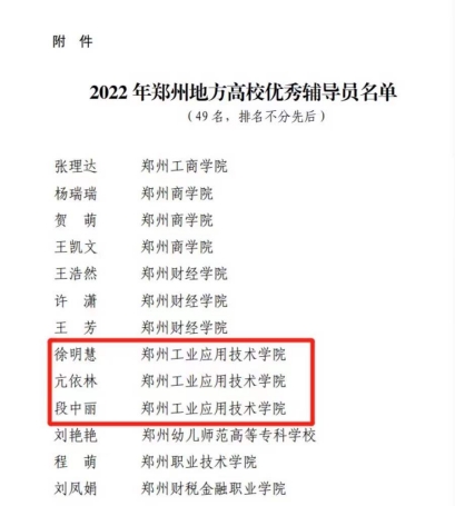 (文/郑恩泽)近日,从郑州市教育局办公室《关于公布2022年郑州地方高校优秀辅导员名单的通知》郑教高函〔2023〕37号获悉,我校徐明慧、亢依林、段中丽3位辅导员被评为“2022年郑州地方高校优秀辅导员”。