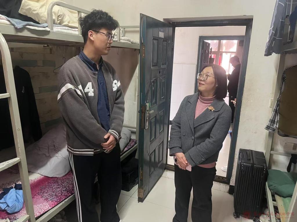 走访过程中,王校长对宿舍设施设备、用电安全、卫生等情况进行了详细查看,对发现的安全隐患及时处理,并细致询问同学们的起居生活、学业进展情况等。在与学生的交流中,王校长提出了三点希望:一是希望同学们强化安全意识,共同维护宿舍安全,全方位筑牢宿舍安全防线;二是希望同学们保持室内卫生,勤开窗、多通风,做好春季健康防护;三是希望同学们能充分利用在校时间,扎实专业技能,学有所成、学有所用,全面提升个人素质。