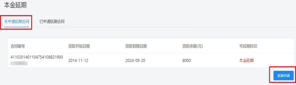 2.系统展示可进行延期申请的合同列表,点击“延期申请”按钮进入下一步(图②);