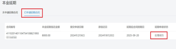 5.点击提交,本金延期申请提交成功,跳转展示已申请延期合同列表(提交成功后,“处理状态”为“申请中”,重新登录系统或刷新网页转变为“处理成功”)(图⑤)。