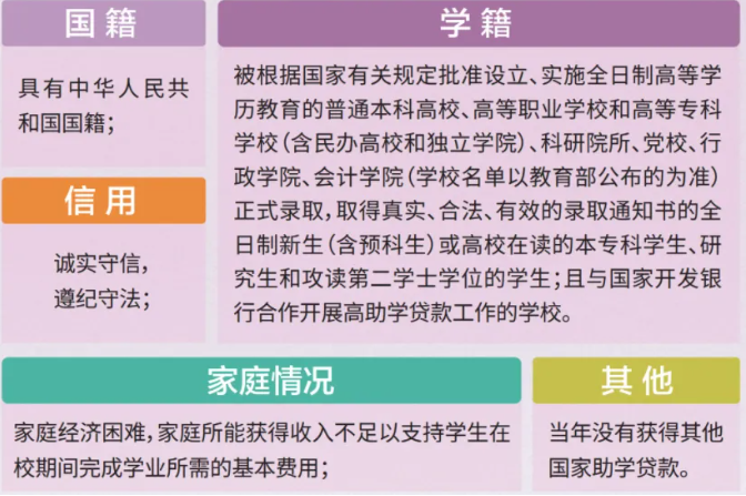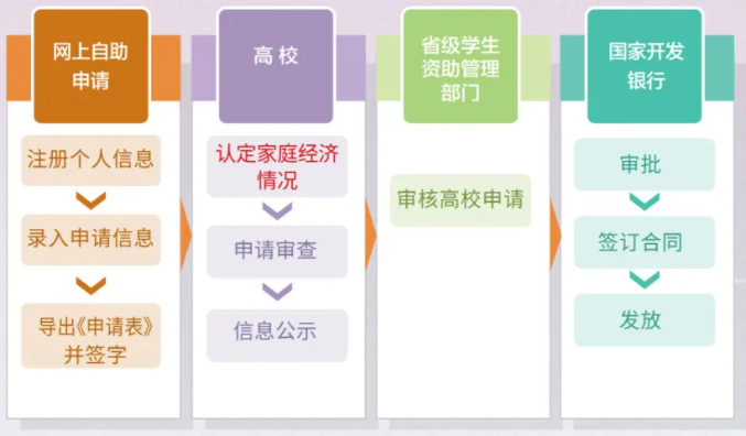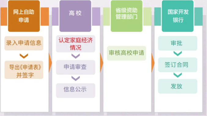 4.省级学生资助管理部门对各高校上报的材料进行审核,审核通过后确定贷款额度,报开发银行有关分行审批后签订合同、发放。