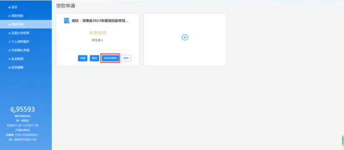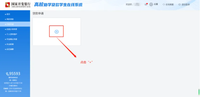 4.1 申请:进入系统首页后,可通过点击首页中“提出贷款申请”或点击左边功能键中的“贷款申请”,进入贷款申请页面后,点“贷款申请”的下面方框中的“+”。