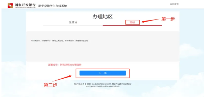 2.2 选择办理地区为“高校”,并点击“下一步”