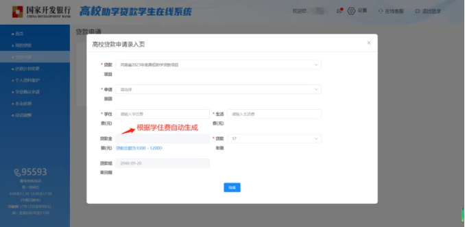 4.2填写贷款申请信息(贷款年限最长期限:剩余在校时间+15年,最长不超过22年),填写完成后,点击“完成”。