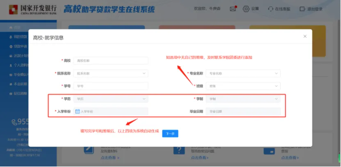 3.2登录后按要求填写就学信息(年级与班级不要选错,否则会导致贴息时间错误,及产生额外的应付利息),填写完成后点击“下一步”。