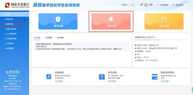 1.登录学生在线系统,完成注册并填写个人基本信息,提出贷款申请,打印《国家开发银行高校助学贷款申请表》并签字。