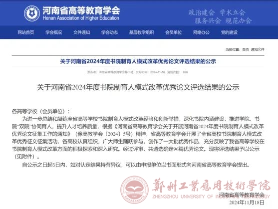 近日,由河南省高等教育学会主办的河南省2024年度书院制育人模式改革工作优秀论文评选结果公示,我校音乐学院《书院制育人模式下探索德育工作的发展之路》、机电工程学院《书院制下的“—站式""学生社区综合管理模式探索》、商学院《基于大学生认知情感视域下的书院制育人模式浅析》等三篇论文被评为“优秀论文”,标志着我校在“一站式”学生社区建设方面取得了新的重要成果。