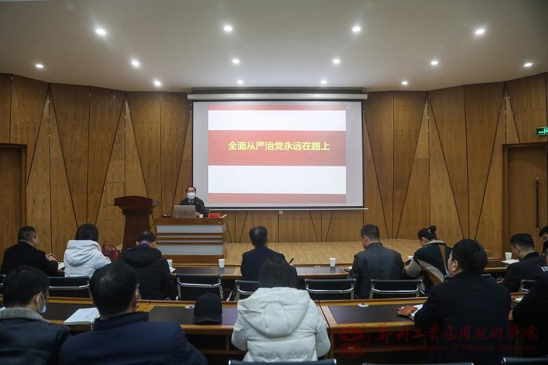 (文/赵雪含 王文莉 图/陈亚翔)12月24日上午,河南省“十大”青年理论专家、郑州市“十大”公务员标兵费凌飞博士应邀来校,在东校区建工楼梦想厅为我校师生做了题为《全面从严治党永远在路上》的主题讲座。校党委委员、各单位党政负责人、各学院党委委员、全校师生党支部书记参加了主题讲座。讲座由党委组织部部长高积学同志主持。