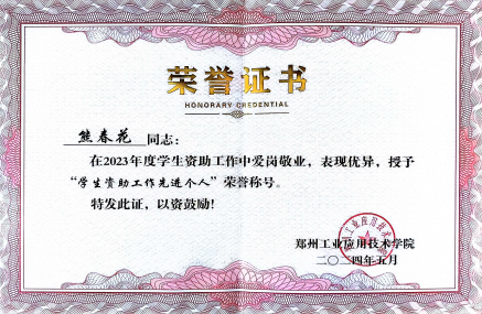 图为熊春花老师“学生资助工作先进个人”荣誉证书