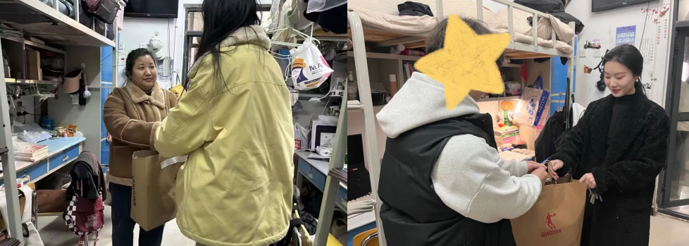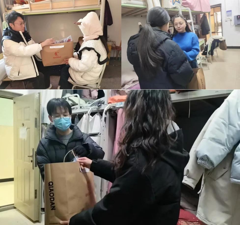 为了进一步做好家庭经济困难学生的资助工作,切实关心学生思想动态及学习、生活情况,落实精准资助和资助育人。医学院于2024年12月18日开展“浓情暖冬 为爱加温”冬季送温暖活动。医学院团委书记王豆豆老师和辅导员老师们走进学生宿舍,送上冬季的关怀与温暖。